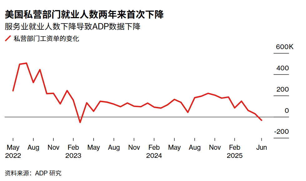 数据显示,6月,美国企业就业人数出现两年多以来的首次下降,反映出服务业就业岗位的减少,这可能引发市场对劳动力市场出现更明显放缓的担忧。